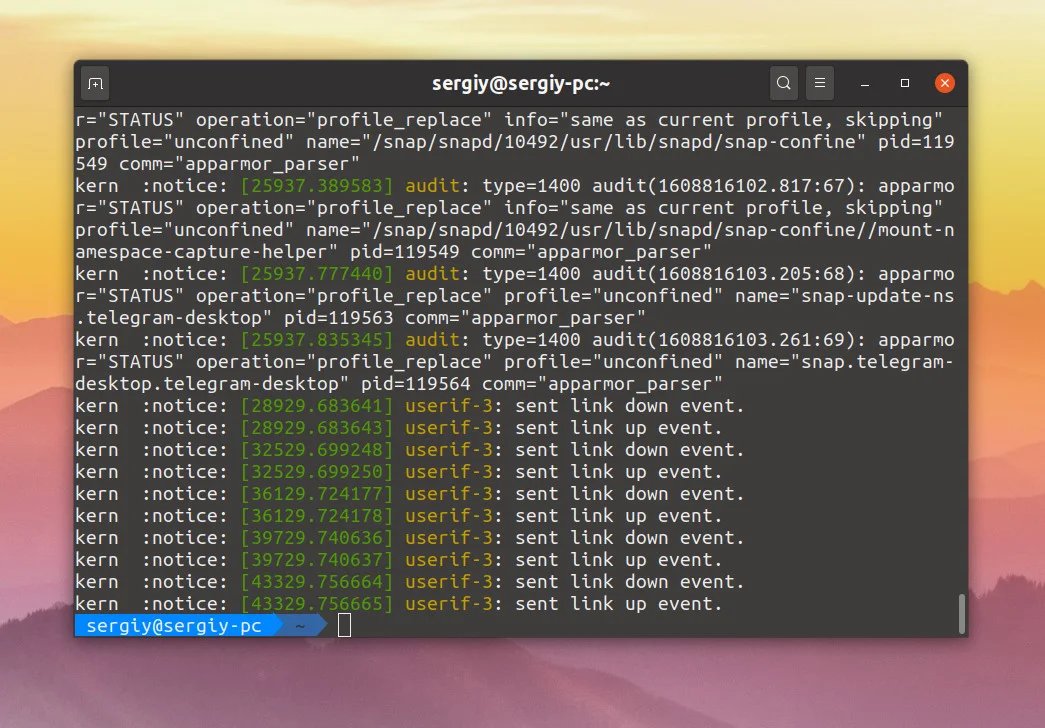 Теперь в выводе утилиты не будет сообщений от Systemd. Если вы хотите выводить все сообщения ядра в реальном времени, используйте опцию -w: