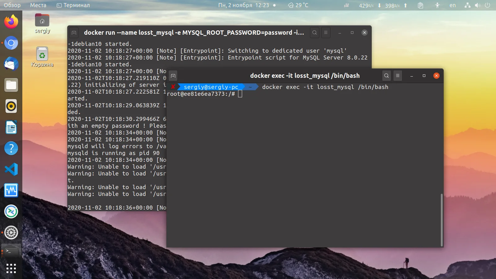 Если нужный вам контейнер сейчас не запущен используйте опцию -a. Обращаться к контейнеру можно по его имени, например, losst_mysql или по его идентификатору, например, ee81e6ea7373. К тому же если вы не задали имя вручную, то контейнер получит автоматически сгенерированное имя и оно тоже вполне читаемо. Например, пока контейнер losst_mysql работает мы можем к нему подключится: