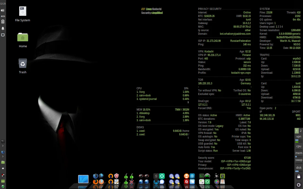 Рабочий стол XFCE здесь не совсем стандартный — панель cairo-dock, расположенная снизу, напоминает о macOS. Обои и стиль системы выглядят по-хакерски, их дополняет апплет Conky, который выводит информацию о загрузке системы, о состоянии VPN, Tor и о многих других параметрах.