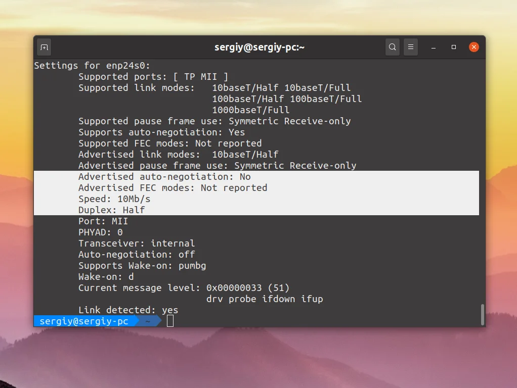 В данном примере, я использовал фильтр egrep чтобы отсеять все интерфейсы, созданные контейнерами Docker, вам этого делать не обязательно. Здесь enp24s0 - это сетевой интерфейс Ethernet, который мы и будем использовать дальше. Выполнив утилиту ethtool без опций можно посмотреть текущие настройки сетевого интерфейса: