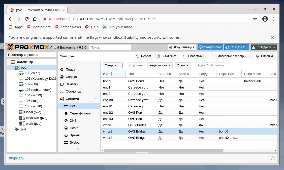 Таким образом, сервер на Proxmox VE можно использовать в качестве ядра виртуальной сети. В этой статье разберемся как выполняется настройка сети Proxmox Ve. Разберем, как настроить виртуальный мост и интерфейс с балансировкой по различным алгоритмам. Proxmox VE позволяет настроить VLAN на базе ядра Linux или Open vSwitch, но это отдельная большая тема, вне рамок обзора возможностей.