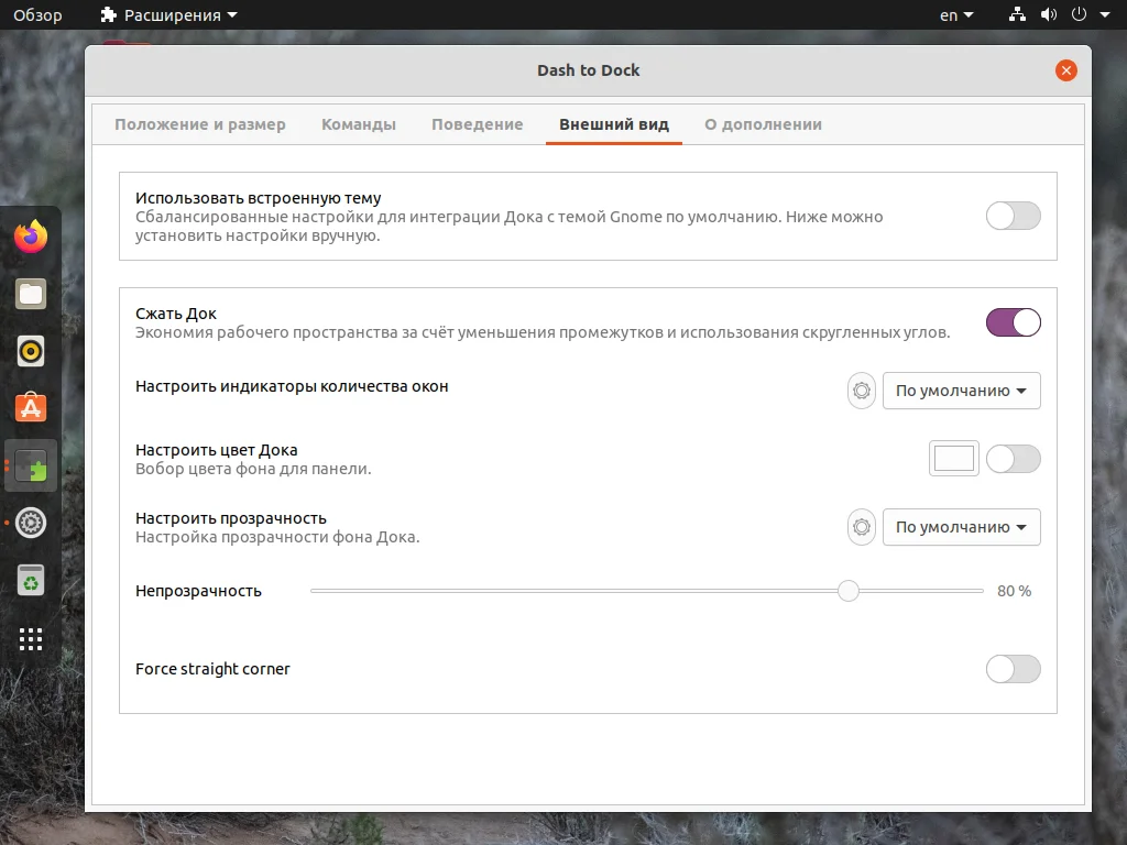 Во вкладке Внешний вид можно уменьшить отступы (Сжать Док), сделав панель более компактной. Имеются также настройки индикаторов, а в расширенных настройках вы можете включить дополнительную рамку для открытых приложений, как это было в оболочке Unity.