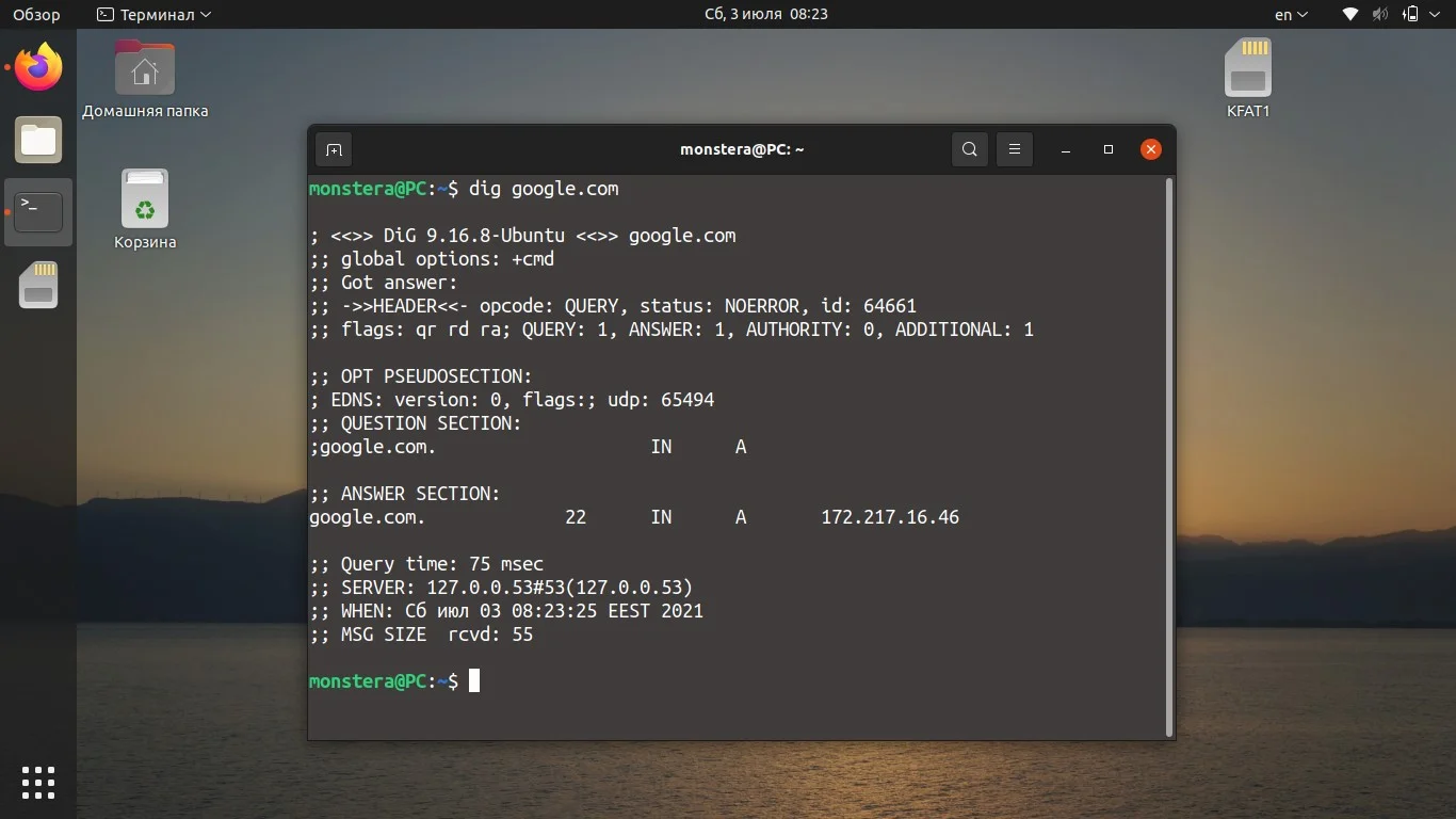 Указывать DNS-серверы можно в формате IPv4 или IPv6. Это не имеет значения и не повлияет на вывод dig. Отправим запрос на публичный DNS-сервер Google. Его IP-адрес: 8.8.8.8. В этом случае запрос в dig будет выглядеть следующим образом:
