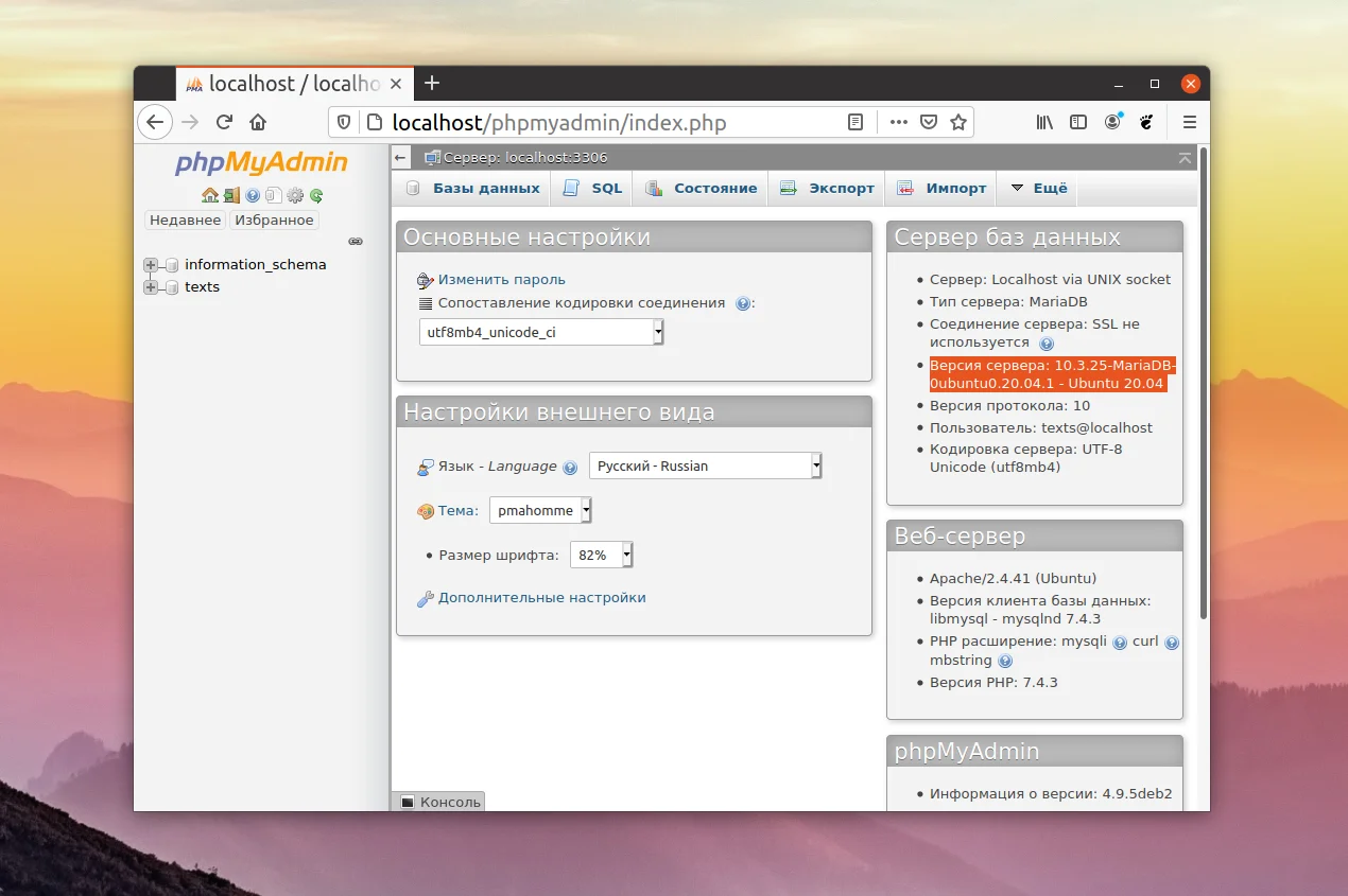 Как видите, в данном случае установлена MariaDB 10.3. Если у вас есть имя пользователя и пароль для доступа к базе данных, вы можете подключиться к ней с помощью консольного клиента. Он тоже выводит версию сервера при подключении. Например: