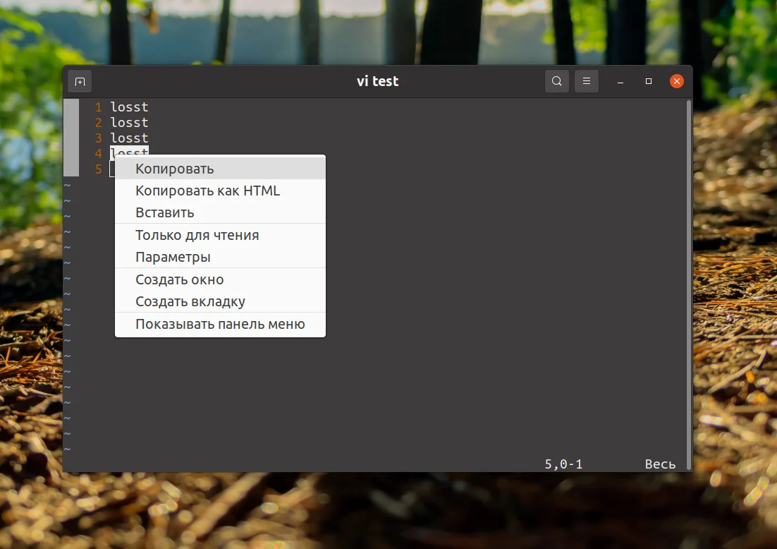 Если в редакторе включена поддержка мыши, то копировать текст, описанным выше способом у вас не получится. Для того, чтобы всё же иметь возможность скопировать текст средствами операционной системы необходимо зажать кнопку Shift во время выделения мышкой. Для копирования можно использовать то же сочетание клавиш Ctrl+Shift+C или же вызвать контекстное меню с зажатой клавишей Shift и выбрать пункт Скопировать: