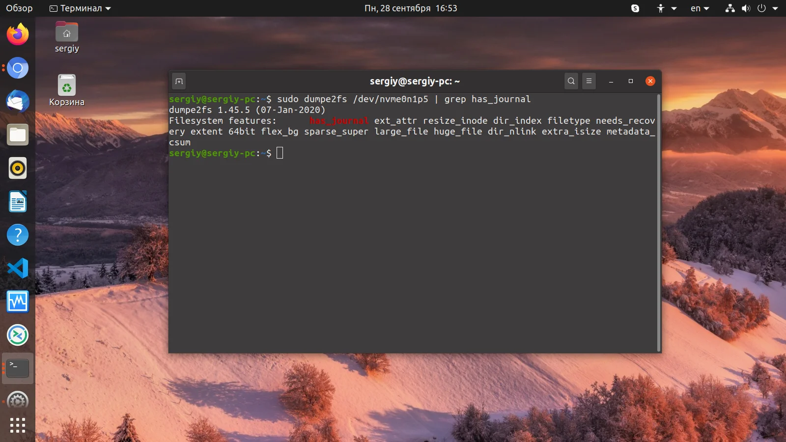 sudo dumpe2fs /dev/nvme0n1p5 | grep has_journal