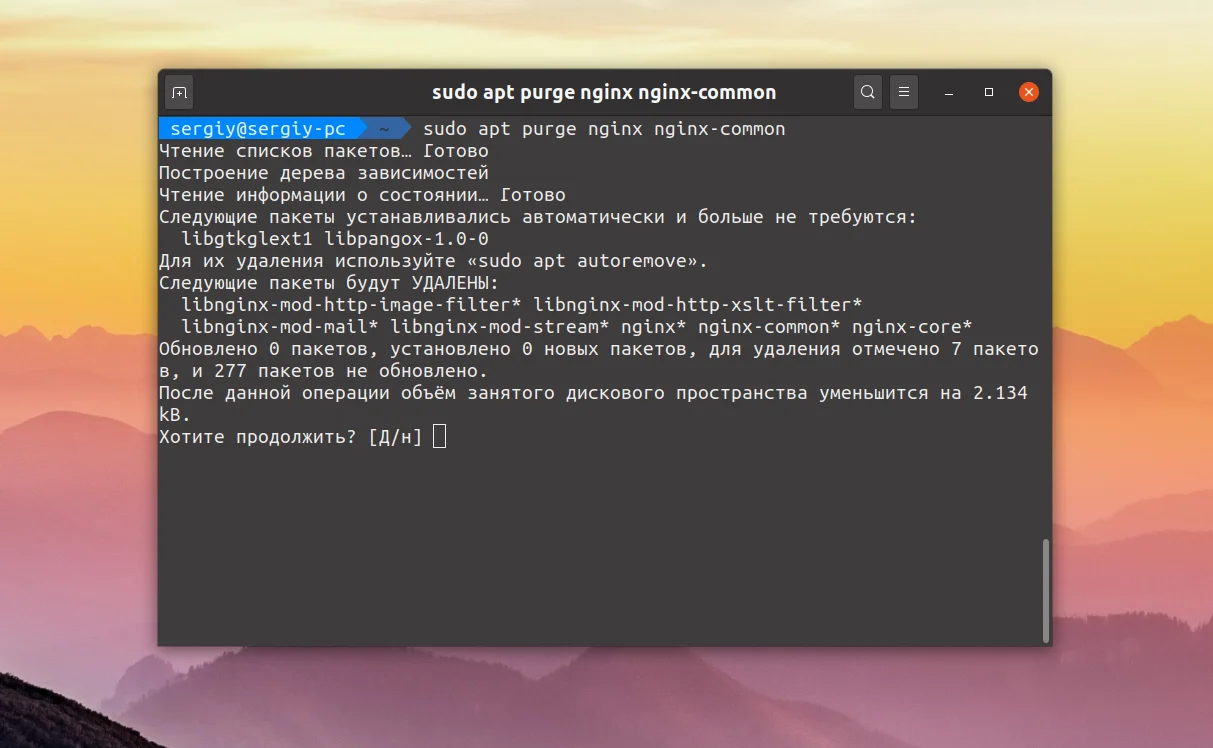 Для того чтобы удалить пакеты, которые были установлены во время установки Nginx, но больше не требуются, надо выполнить: