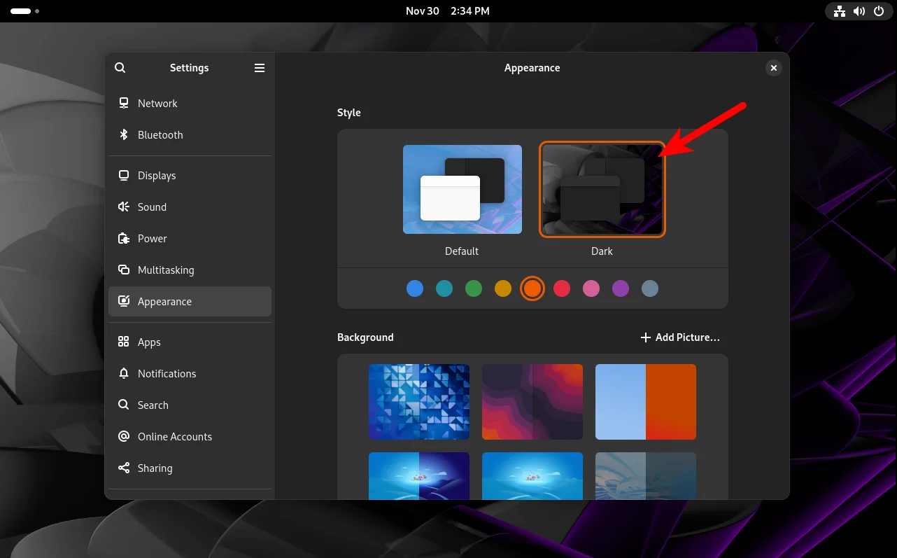 gsettings set org.gnome.desktop.interface color-scheme prefer-dark