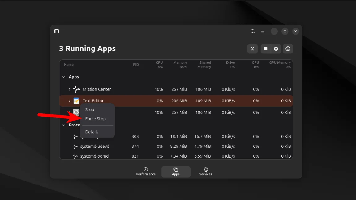 Встроенный диспетчер процессов в GNOME использовать не очень удобно, поскольку там выводится список всех процессов. Mission Center же вверху списка выводит приложения, у которых есть окна. Для этого откройте вкладку Apps: