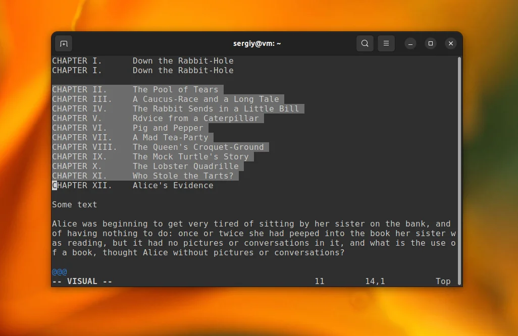 Как видите, это довольно сложно, особенно если вы не привыкли использовать эти клавиши. Есть более простой способ. Вы можете скопировать текст в регистр по умолчанию, а затем скопировать его оттуда в системный буфер обмена с помощью командной строки Vim. Для этого скопируйте текст как обычно, а затем используйте такую команду: