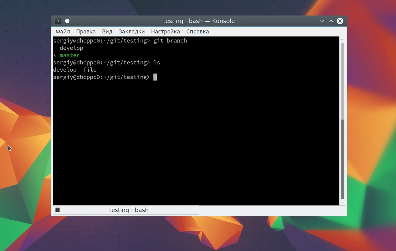 Опция -a указывает что нужно вывести все ветви, даже не синхронизированные. Звездочка указывает на активную ветвь. Теперь создадим ветвь для разработки с помощью команды checkout:
