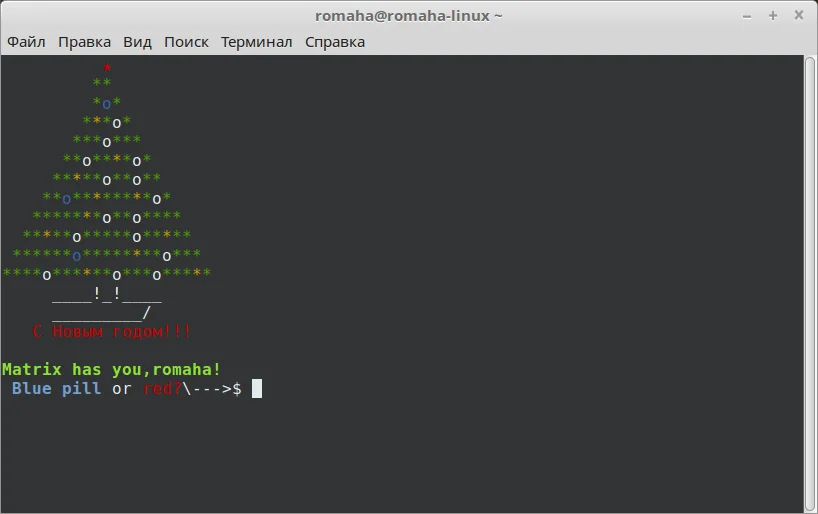 Ну ладно, на самом деле, если в конец .bashrc вставить echo -e "С Новым годом", то поздравление будет выводиться при каждом запуске терминала перед приглашением ввода. Соответственно, вывод можно раскрашивать каким угодно способом. А там уж и ёлку нарисовать не сложно.