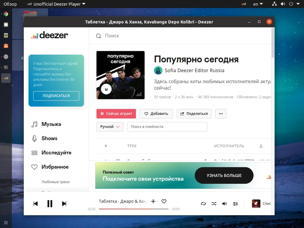 Deezer уже много лет планирует выпустить клиент для Linux, но дальше обещаний дело не идёт. Поэтому энтузиасты выпустили неофициальное приложение. И опять нас встречает браузер. В этот раз его функционал расширен иконкой в трее, через которую можно управлять воспроизведением. Офлайн прослушивание музыки недоступно. Работа программы не самая стабильная и при потере связи она может вылететь.